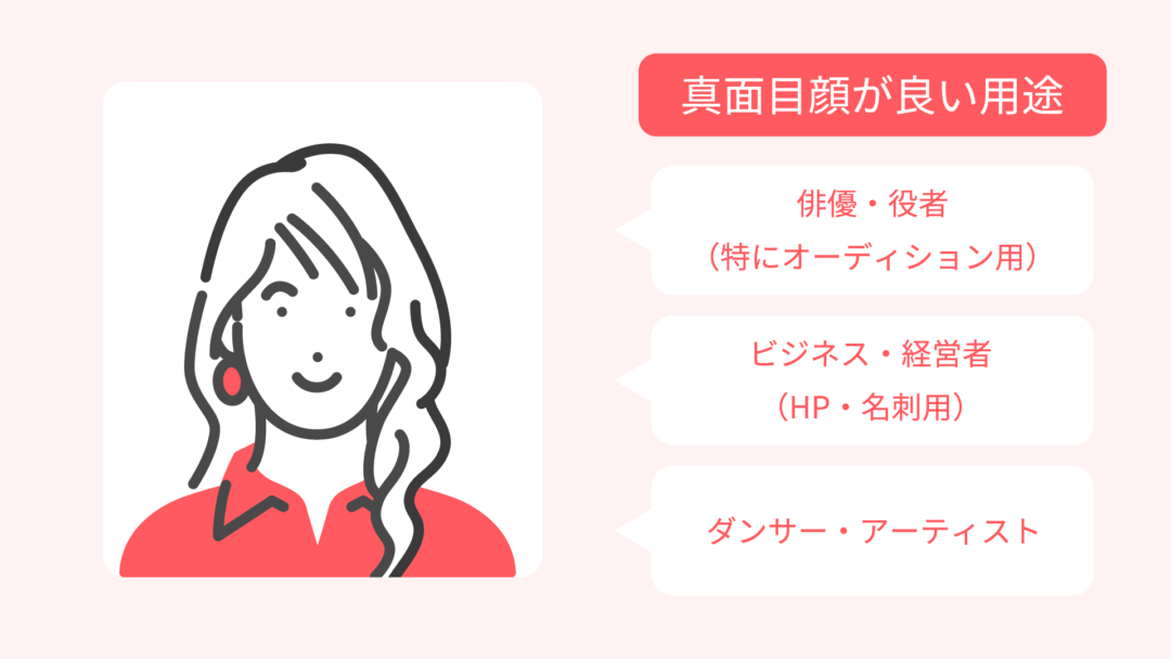 - 目線は上目遣いや見下ろすことなく、自然に正面からカメラを見ること