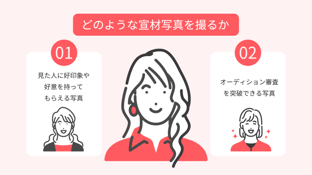 宣材撮影をする場合、かかる費用はもちろん大切ですが、宣材写真は自分を宣伝するツールであるため、料金と同じくらい「どのような写真を撮るか」が重要となります。
