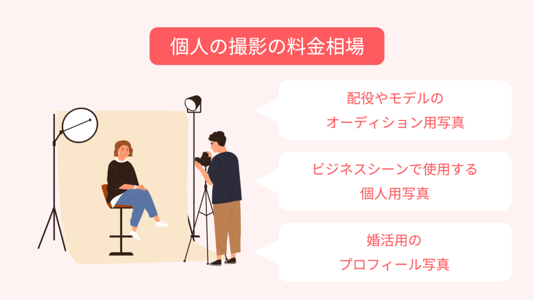 個人で受ける配役やモデルのオーディション用写真、ビジネスシーンで使用する個人用写真、婚活シーンでプロフィールなどに設定される写真は、被写体がひとりとなり「個人撮影」扱いとなります。