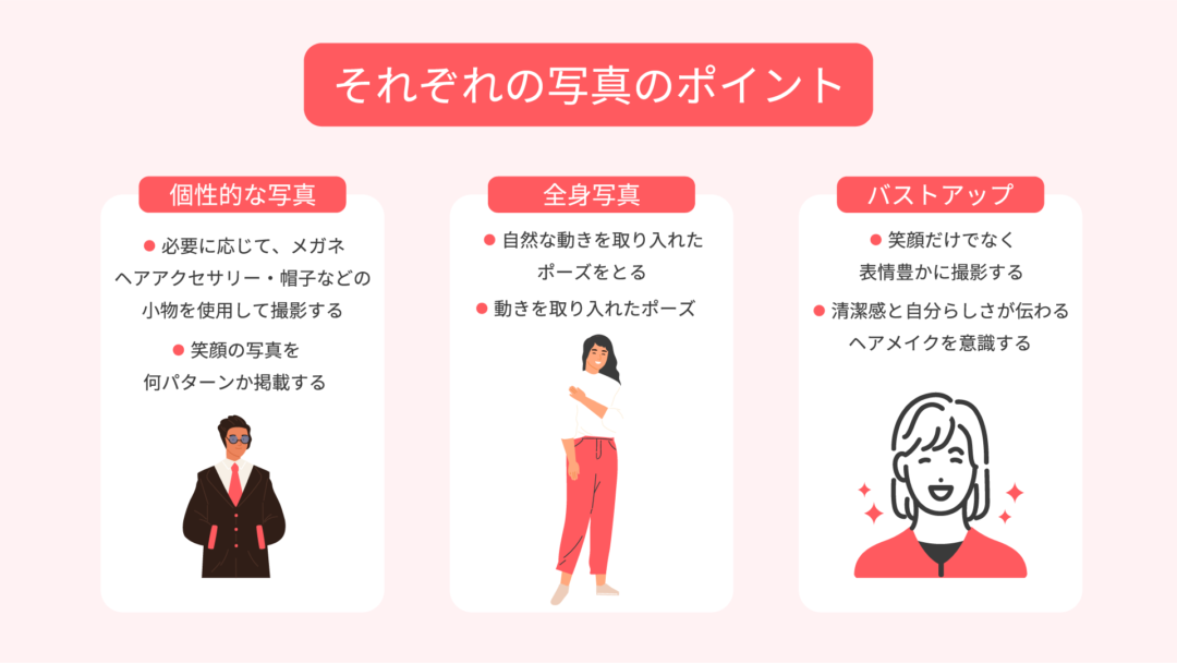 上記のように、バストアップと全身写真にはそれぞれの役割があり、被写体の等身大を伝ええつつ、第三者から見たときの魅力を写し出すことが求められるため、2枚撮影されることが基本となっています。
