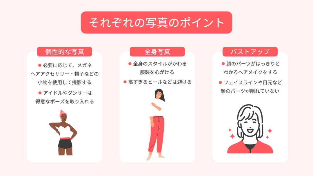 宣材写真は、少なくとも「上半身の写真(バストアップ写真)」と「全身の写真」の2カットが必要となります。